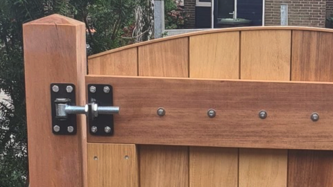 • Plaats vervolgens je houten poorten op de juiste hoogte en stel deze waterpas. Meestal komen de poorten circa 8 à 10 cm boven de grond. Uiteraard is dit afhankelijk van de bodem. Als deze oploopt dan komen de poorten meestel hoger. Je kan dit van tevoren uitmeten met een waterpas.