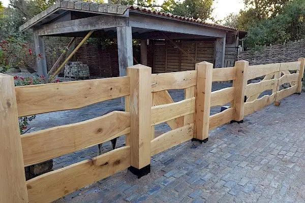 Landhek van houten schaaldelen LK33-R is een prachtige houten poort met een landelijke uitstraling. Dit robuuste en stoere houten hek zal prachtig staan bij jouw woning, oprit, tuin of weiland. Dit eiken schaaldelen landhek bestaat uit drie brede horizontale planken.